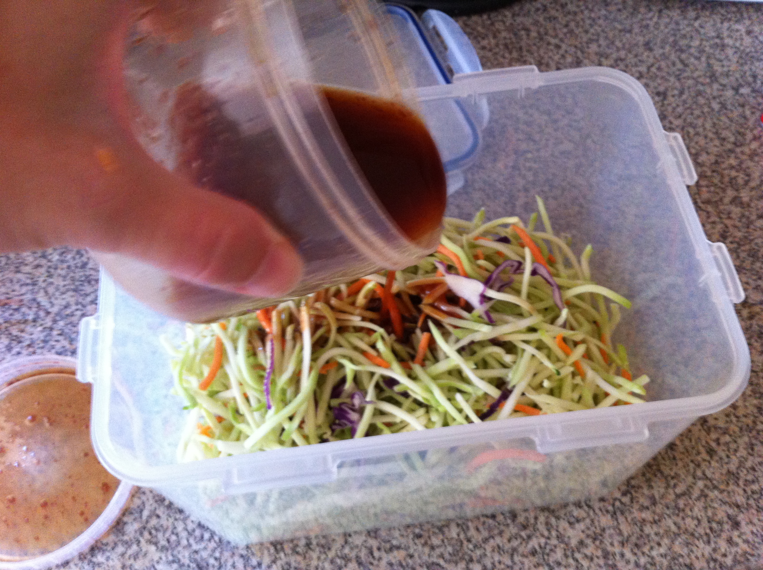 Mix all ingredients together by shaking in a jar or storage container. It keeps well in the refrigerator and is very tasty on broccoli slaw or baby greens. For broccoli slaw, which you can buy in bags at most grocery stores, I add slivered almonds, craisins, about 1/3 cup of the above dressing and let marinate for a few hours before serving.
