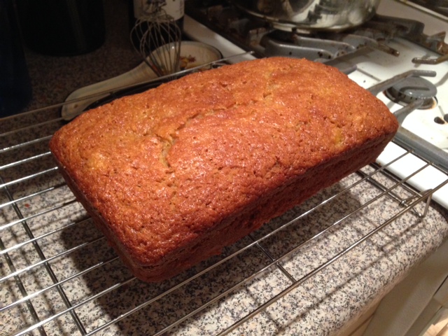 As long as I’m talking pumpkin, I’ll share our recipe for pumpkin bread – it’s a variation on my go-to banana bread recipe. Somehow dazzled by the abundance of pumpkin on hand, I smooshed 3 cups worth of pumpkin into the loaf when the recipe calls for 2. I think that was to its discredit this time around, though it still turned out very nicely and is holding up well 3 days later. So if you do try to make it, don’t wing it with the pumpkin. You can overwhelm the balance of spices if you overdo it. At two cups of pumpkin it will be plenty moist. One of the most important steps for success, I think, is to turn the finished loaf out of the pan and onto a cooling rack so the steam can escape.