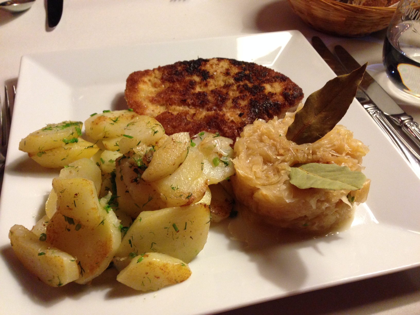 Breaded pork cutlet with (perfect) dilled potatoes and a braised, marinated cabbage. Think sauerkraut but not so vinegary. (Warsaw, Poland)