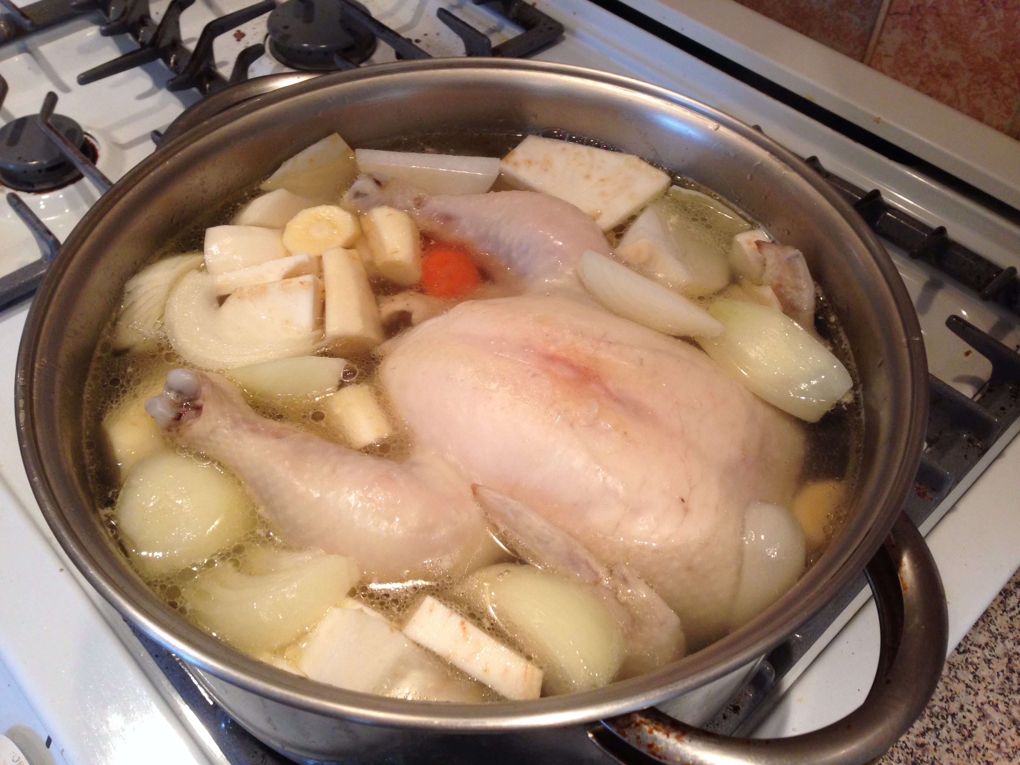 Around the time that the water gets closer to boiling, the chicken starts to throw off a fine-bubbled scum. Scoop it up and remove it with a tablespoon. (I usually dump the scum into the measuring cup that’s still sitting by the pot from when I added the water. This time I had about ¼ cup of the bubbly scum liquid in al.) It is going to take 3-4 skimmings, or around thirty minutes from when you started heating the water, until there is no more scum. If your chicken is poking out above the water, it’s advisable to flip the bird over some time during this period of cooking.