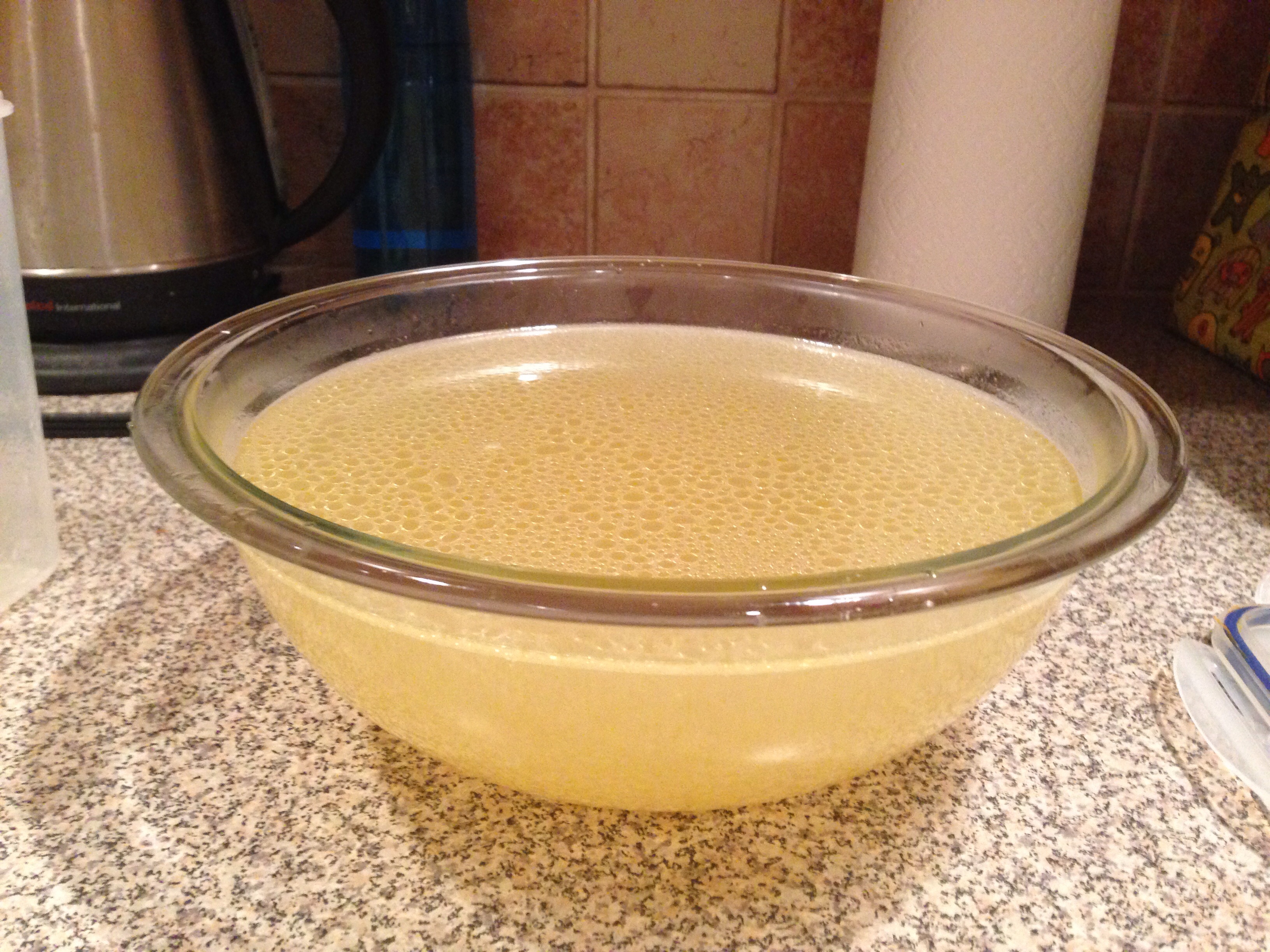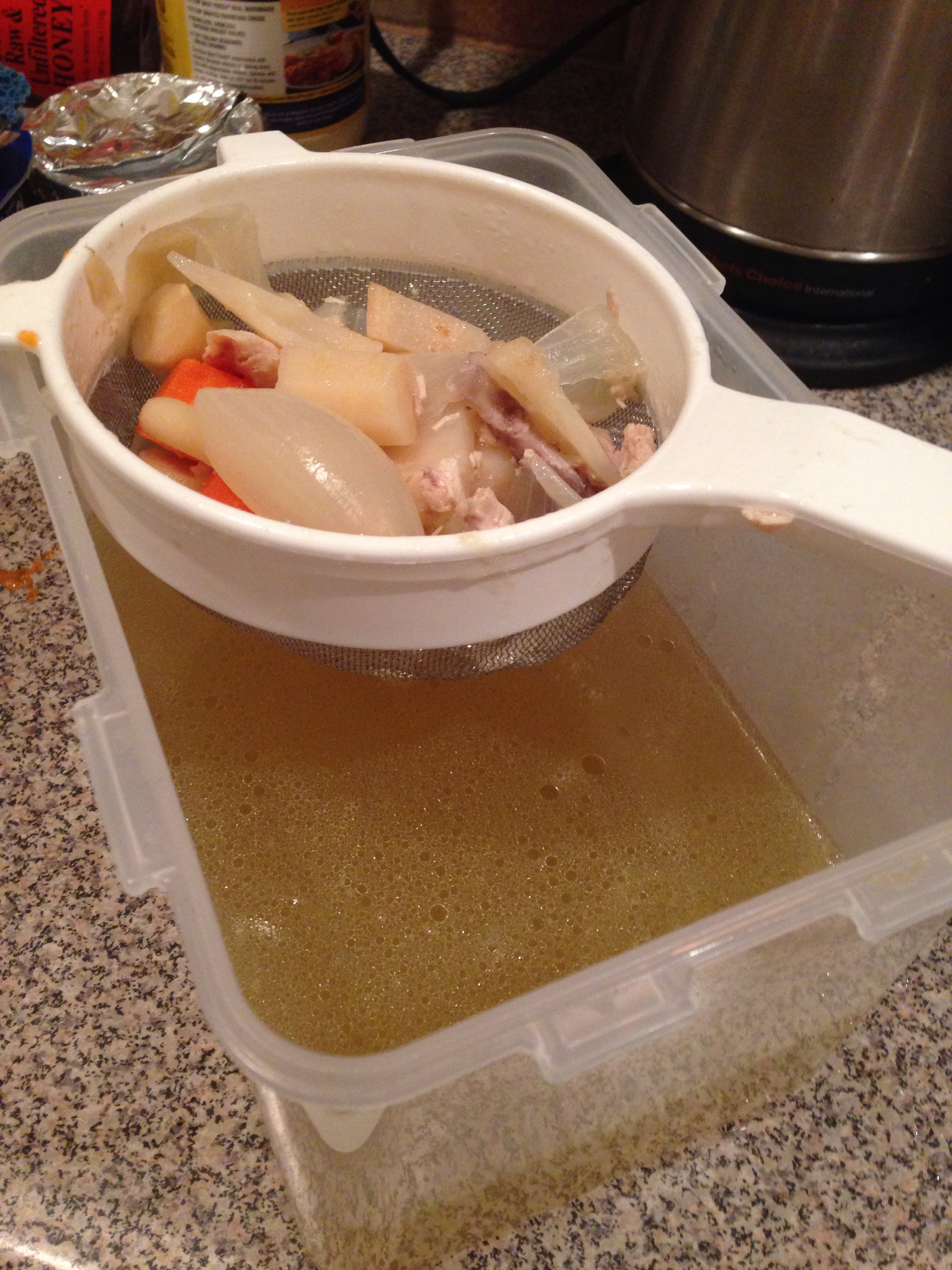 Straining the stock: Let the soup cool for about 30-45 minutes after you have turned off the heat. Pull out the carcass and other big chunks of stuff and put in a colander so that it won’t be super soggy when it goes in the compost – if you have a dog in the family, they’d probably like that cooked-out chicken just fine! Use a bowl, a big plastic storage container and a mesh strainer. Do the first straining through the mesh strainer into the big bowl, then do the second straining into the storage container.