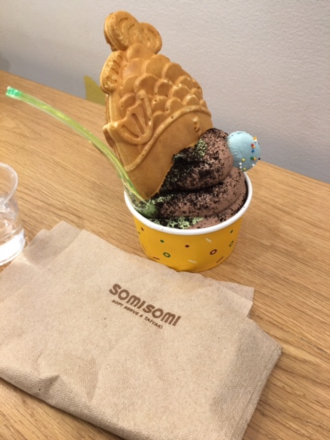 Somisomihttps://www.somisomi.com/ is a chain with 18 locations in California and 5 more on the way. They are also in Texas, Nevada and Washington state. Watch out San Francisco and Palo Alto, you are getting your thrill next with new stores opening soon. There are two in my area – Sacramento, next to the city college campus, and in Elk Grove. Their soft serve is delicious, and the flavors are not too sweet. The taiyaki fish-shaped waffle cones are so good. This “Upside Down Ah-boohng” as they call it, pictured below, is a chocolate and matcha swirl, and I chose custard as my filling for the taiyaki. The next time I went I chose the nutella filling and that was such a tase treat that I will probably never choose anything else again. The swirl options change weekly.
