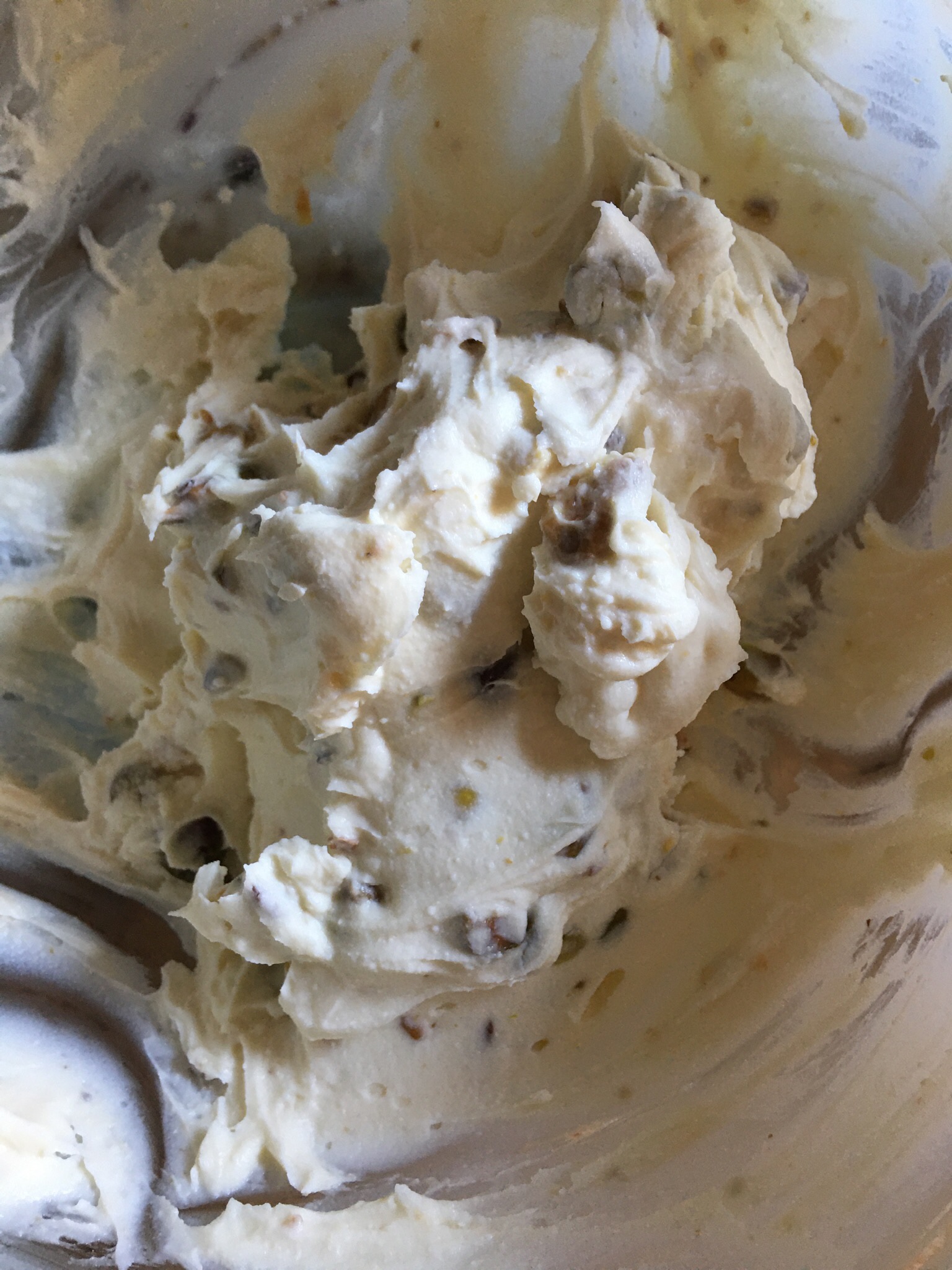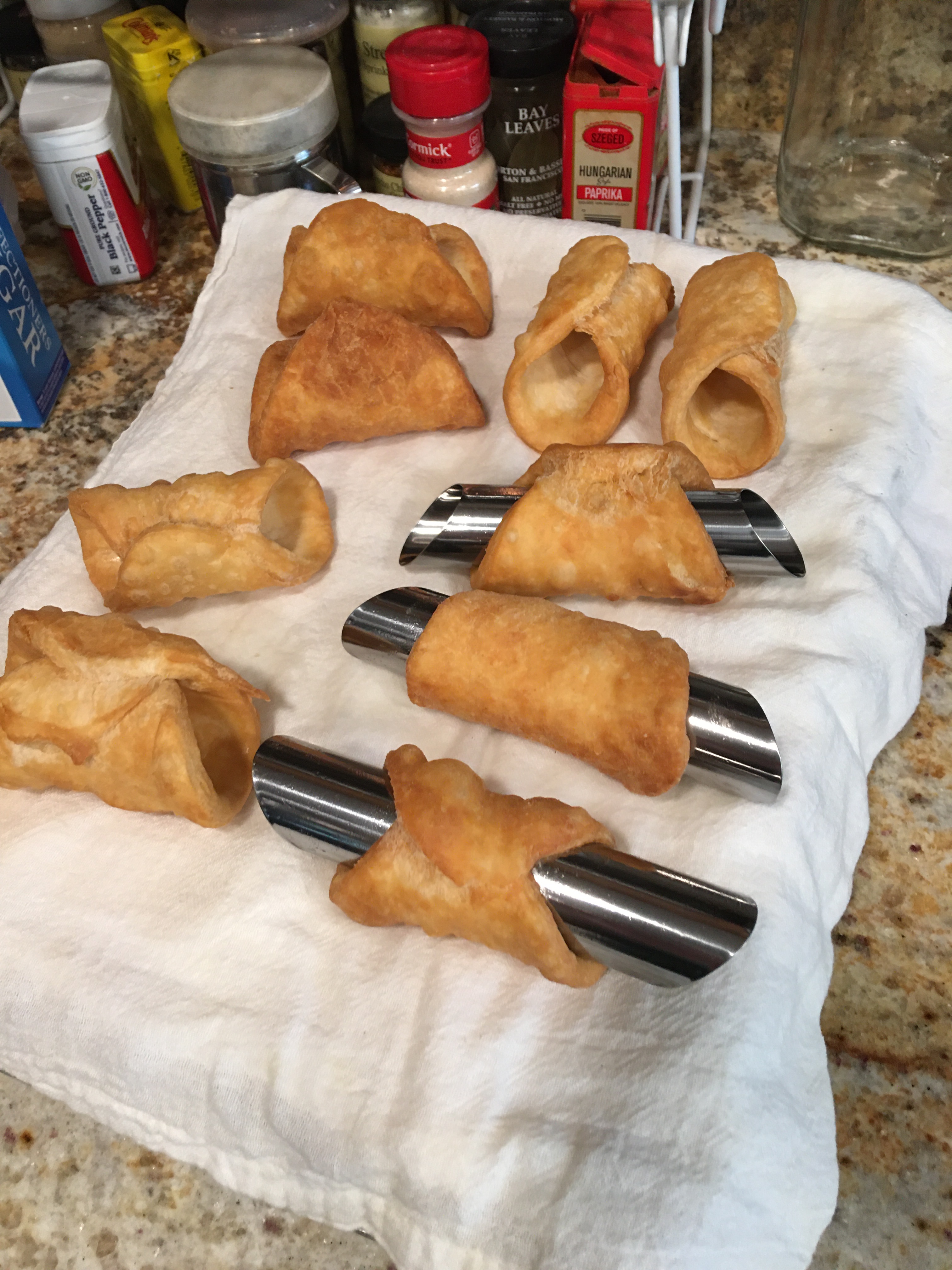 On to cannoli. This is still a work in progress. I have made the filling about four times now. The filling is yummy, and fairly easy to put together. I experimented to get the taste the way I remember it, as the first recipe I tried was sweet and creamy but had no Italian edge to it. This was again the America’s Test Kitchen version, and their recipe called for store bought cannoli shells, which I have never seen. The main ingredients for the filling are ricotta cheese and mascarpone, both available at the grocery store, and confectioners’ sugar. What I added to get it closer to the New York ones I remembered was a tablespoon of lemon and a pinch of nutmeg. I also made the ratio two parts ricotta to one part mascarpone as opposed to the first recipe that said to use equal parts ricotta and mascarpone. My neighbors and I tasted the results of each trial, using broken pieces of store-bought waffle cones to scoop up the filling. It is a fine way to go.