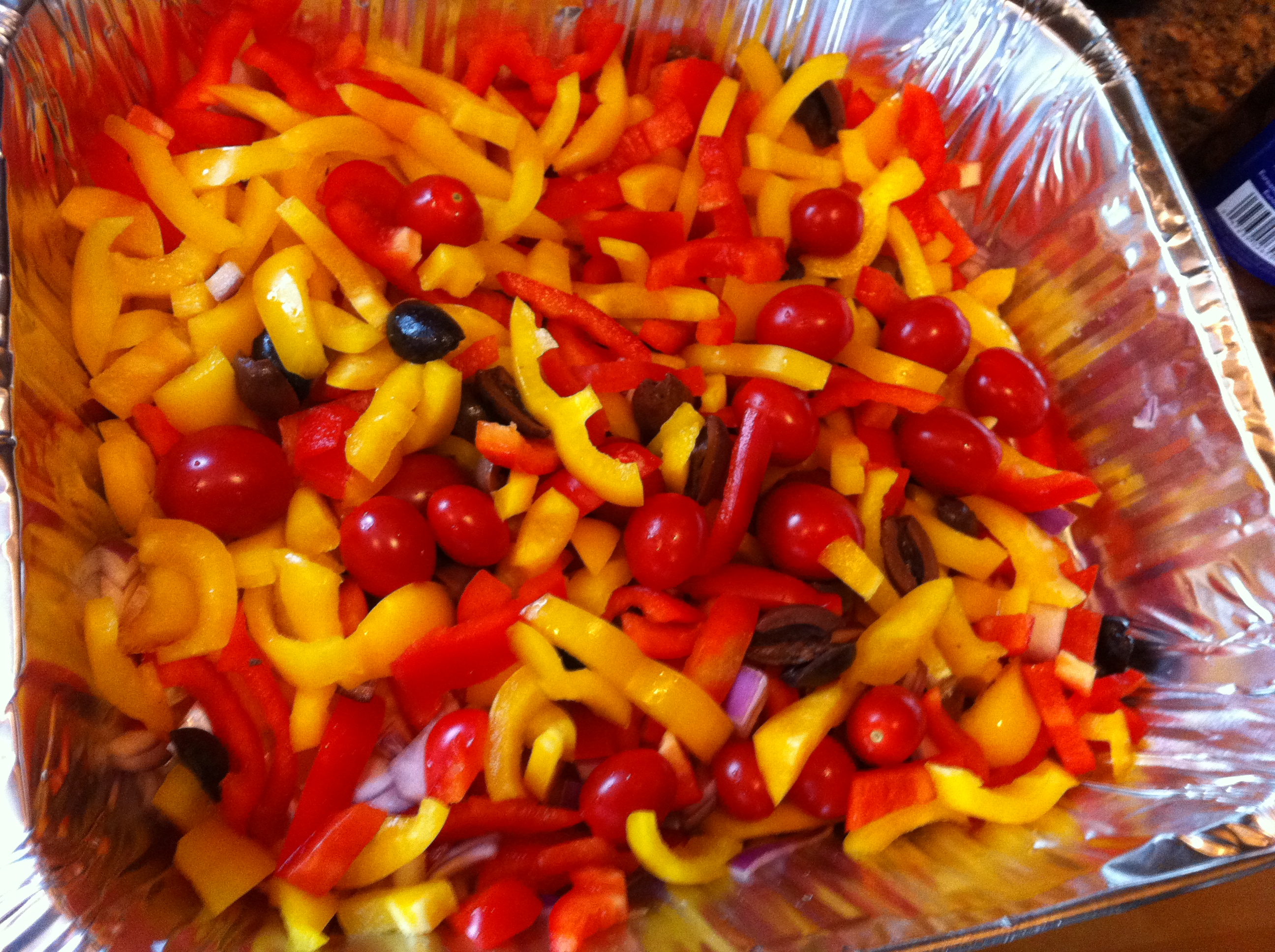- 5 bell peppers, seeded and sliced julienne, preferably 3 colors to your taste