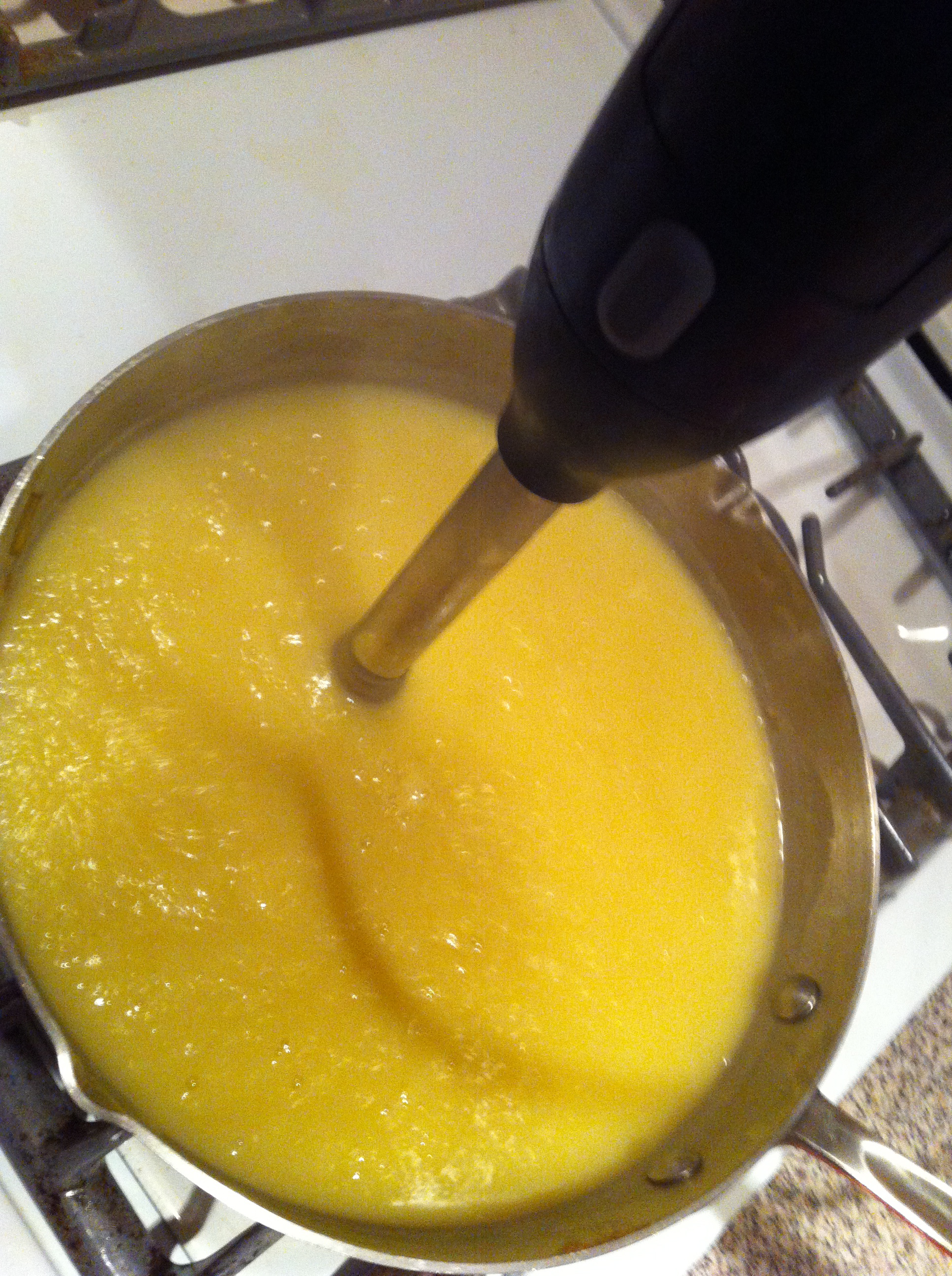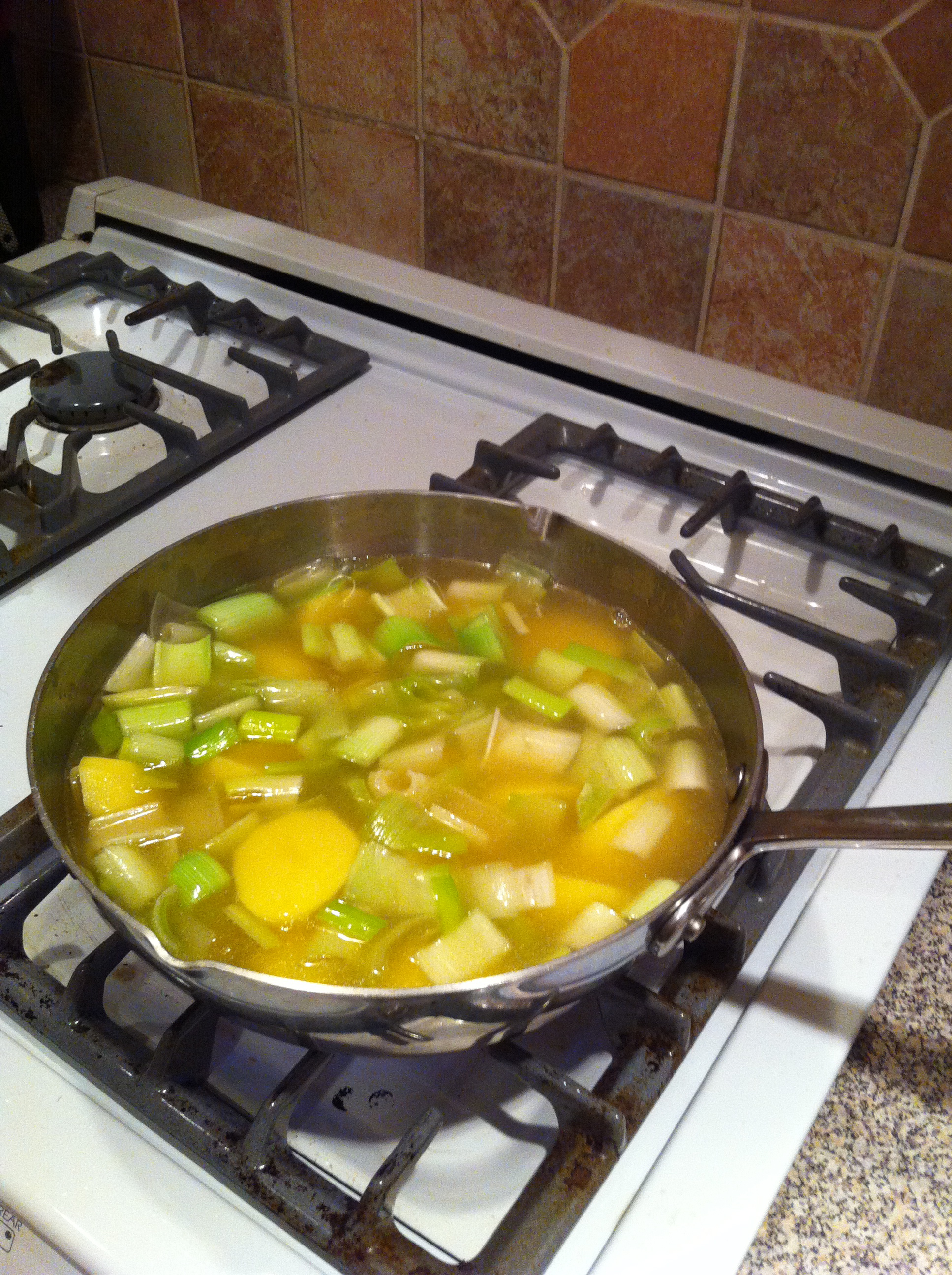 Take soup off heat and, using a stick blender, blend the ingredients until there are no chunks of potato or leek, adding a small amount of whole milk to help consistency. (Don’t add milk if you plan to serve it the next day or freeze it. Milk can be added when it’s reheated.) Season with pepper and a little salt. Put soup back on burner and heat through before serving.